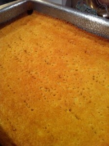 You’ll then gently pierce the entire pan of brownies with a fork. Pour the glaze over the brownies and cool cake.