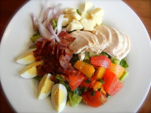 Chicken & Cheddar Chop salad…”chicken, bacon, white cheddar (chunks), egg, tomato, red onion on romaine lettuce tossed in an herbed vinagrette”. (ask for the dressing on the side if needed…also try the housemade honey chive dressing!) This is a simple, fresh & filling salad served straightforward without all the pomp & circumstance you find with many “entree” type salads on other menus!