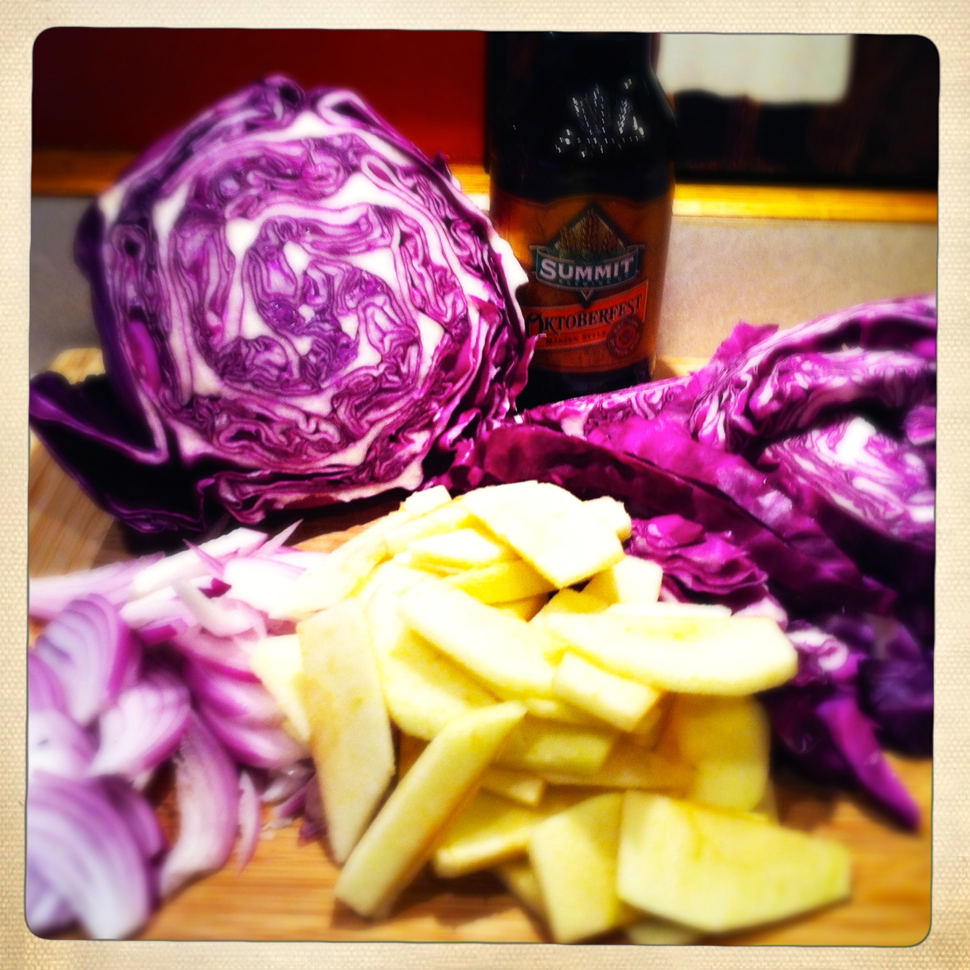 So, thinking of cooler temps (because we are again back in the heat here) I wanted to do something that would go good with sausages or pork…and because I had just picked up a whole head of purple cabbage from my CSA, I thought Beer Braised Red Cabbage would be perfect! I found the original recipe here, but as I do with most recipes, I doctored it up to suit my needs.