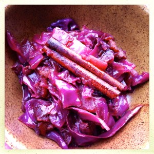 At this point, you’ll then want to put in the cabbage and apple; Stir until fully coated in the butter etc. Let this start to wilt down a bit and then add your chicken stock, vinegar, cinnamon stick and sugar. Again, stir a bit to coat and let wilt for a couple of minutes. The add your beer, turn the heat down and cover to simmer for 30 minutes (plus or minus depending on how you like the texture of your cabbage) stirring every so often and ensuring it’s not losing liquid and/or sticking to the bottom of the pan. About halfway thru this time, taste the cabbage to check for adequate sweetness & “done-ness”. Both of which are very selective. Adjust as necessary and feel free to add a bit of salt & pepper at this point as well. Continue cooking until the cabbage is as tender as you’d like it.