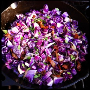 This dish could be made more amazing by adding more bacon, more apples or other delicious fruit (figs, apricots, etc.) fresh herbs like Thyme and even some fall seasonings like clove, nutmeg. The picture above is with Mission Figs & Thyme (in addition to the above ingredients) that I actually cooked in my cast iron skillet on the grill the other day! Provided you add enough liquid and really keep an eye on it, you could cook this under a small pork roast in the oven as well and the cabbage can absorb all those succulent meat juices while it cooks! YUM!