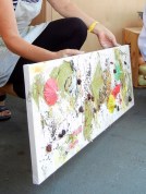 With this being the last round, we had a better handle on the whole point scoring process. It sounds like an awesome job to have, but with so many categories and food/art perspectives to keep in mind, it truly was a difficult challenge for us judges! Chef Sarah made a perfectly cooked & delicious piece of Pork Loin, with Chocolate-Beer Mustard sauce and an Arugula salad with puffed Wild Rice. Chef Tammy’s dish had many things going on, from stir-fried beef & mushrooms, a chocolate fruit salad and an asian slaw that had crunchy, barely cooked bits of Wild Rice. She took full advantage of the Whole Foods pantry for sure! The artists creations this round were unique as well, with Artist Bill Wolfson’s gorgeous painting taking cues from Rainbow Chinese’s color palette & incorporating her dish into the final design. I was completely in awe of Artist Rebecca Phan-Tretter rendition of the Stone Arch Bridge, incorporating the beer & Chef Sarah’s dish into the final design construction. And in the end, the winner was…