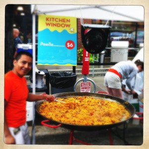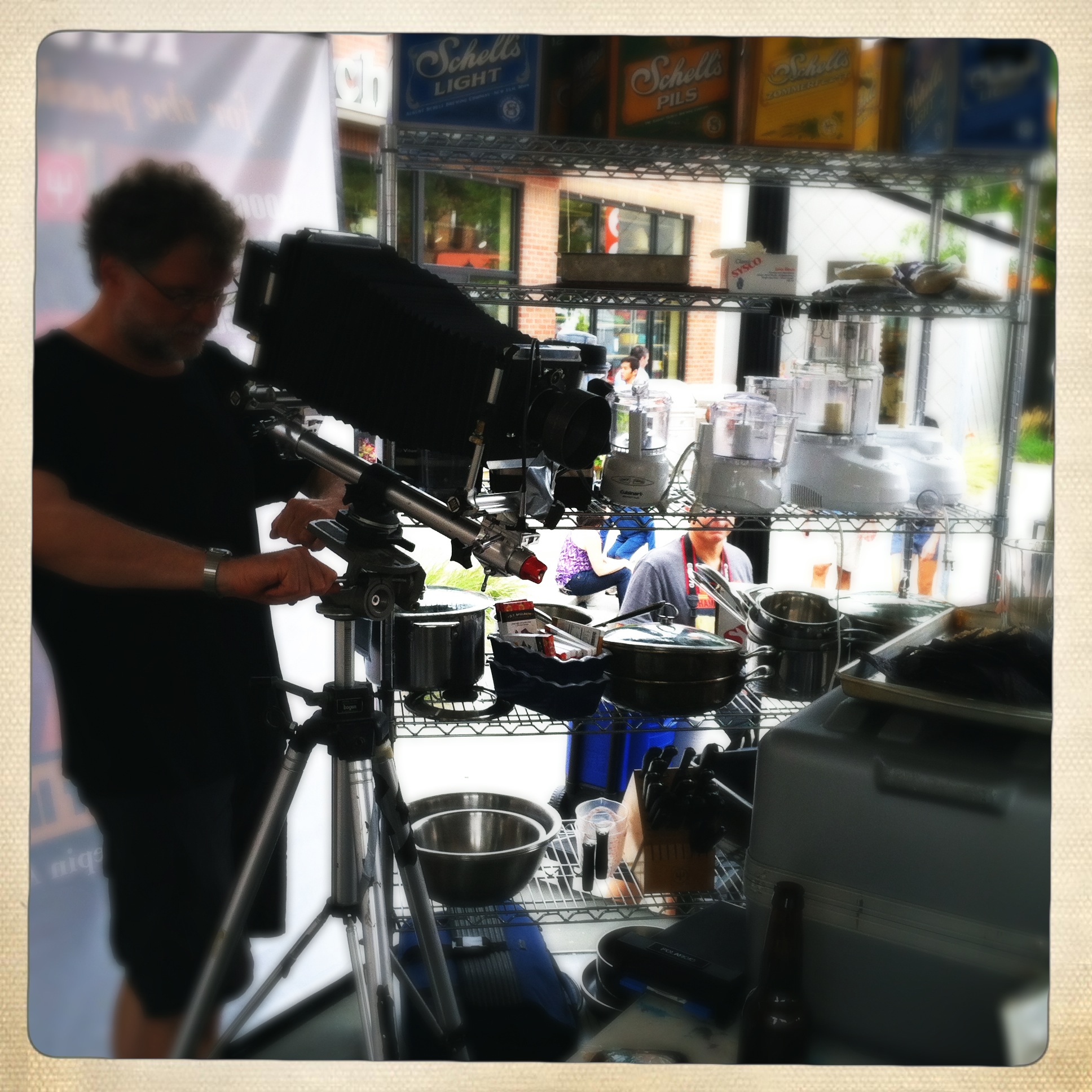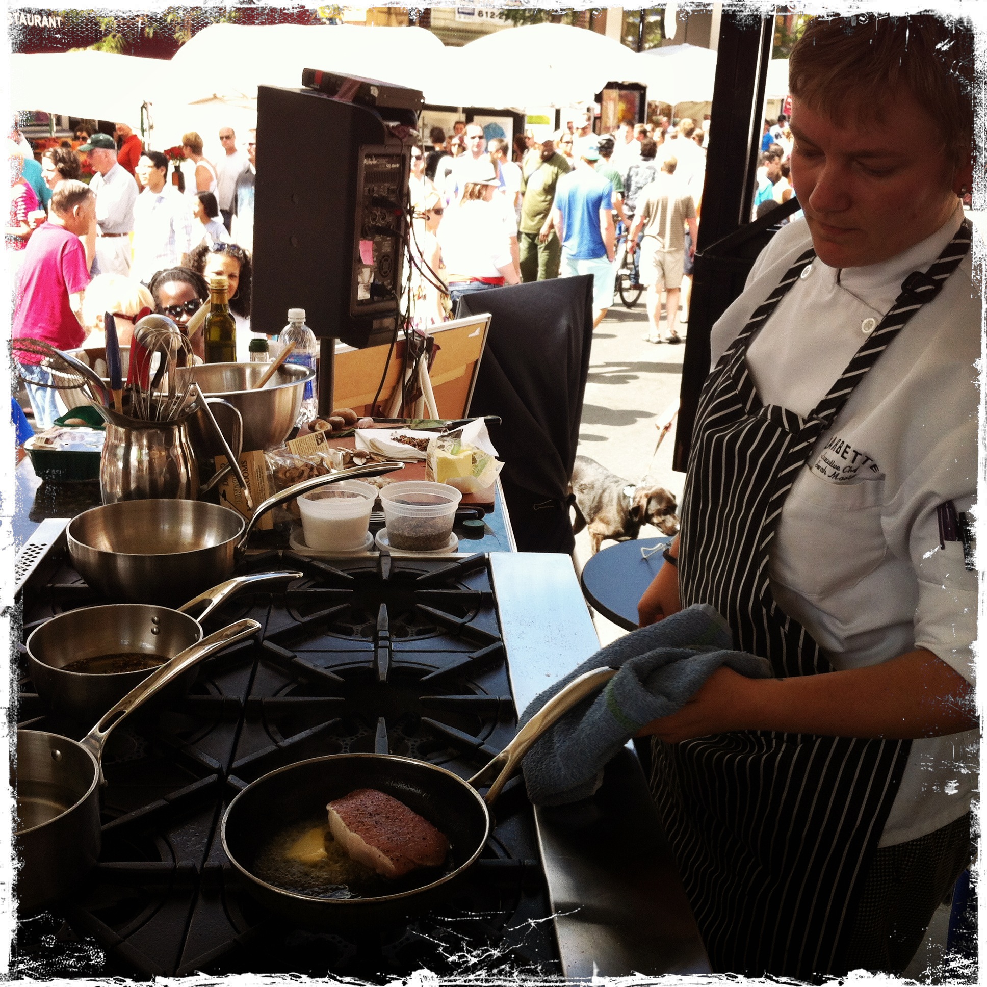 The first weekend in August, brought the inaugural 2012 Kitchen Window Culinary Arts Competition put on by the Uptown Art Fair and sponsored in part by Kitchen Window. The phrase “Celebrity” judging was given by one of my favorite foodie friends and fellow judge Emily Sue Anderson of The Broccoli Stalker. We laugh about the title because it left many of us food blogger friends who participated asking ourselves, how are we “celebrities”? (okay, there are at least a couple of you, reading this that are celebrities in my eyes : ) Pretty cool, but my guess is the real celebrities weren’t available! Anyway, I had a blast! The picture above is of myself along with the two other judges I had the honor of hanging with all day. Amanda Rettke & Melissa Hoepner. I’ve hyperlinked their food blogs so you can check them out! These girls are the best…I miss you both! The competition was held over Friday, Saturday & Sunday. The 1st & 2nd place winners (most points) from each days competitions would move on to the semi-finals on Sunday. Each local Chef contestant was paired with an Uptown Art Fair Artist and they were charged with putting together a dish, and a piece of visual art. The teams were given thirty minutes and the food was made using three required ingredients- beer from Schell’s Brewing, artisan chocolates from local chocolatier B.T. McElrath and rice from Gourmet House® Rice. In addition to that, one secret ingredient, unveiled to them just minutes before competition time. They had use of a full pantry of items sponsored by Whole Foods and the artists pretty much could do what they wanted, as long as it somehow tied into the Chef’s dish. I saw some very creative things come out of this competition!