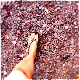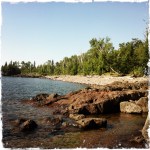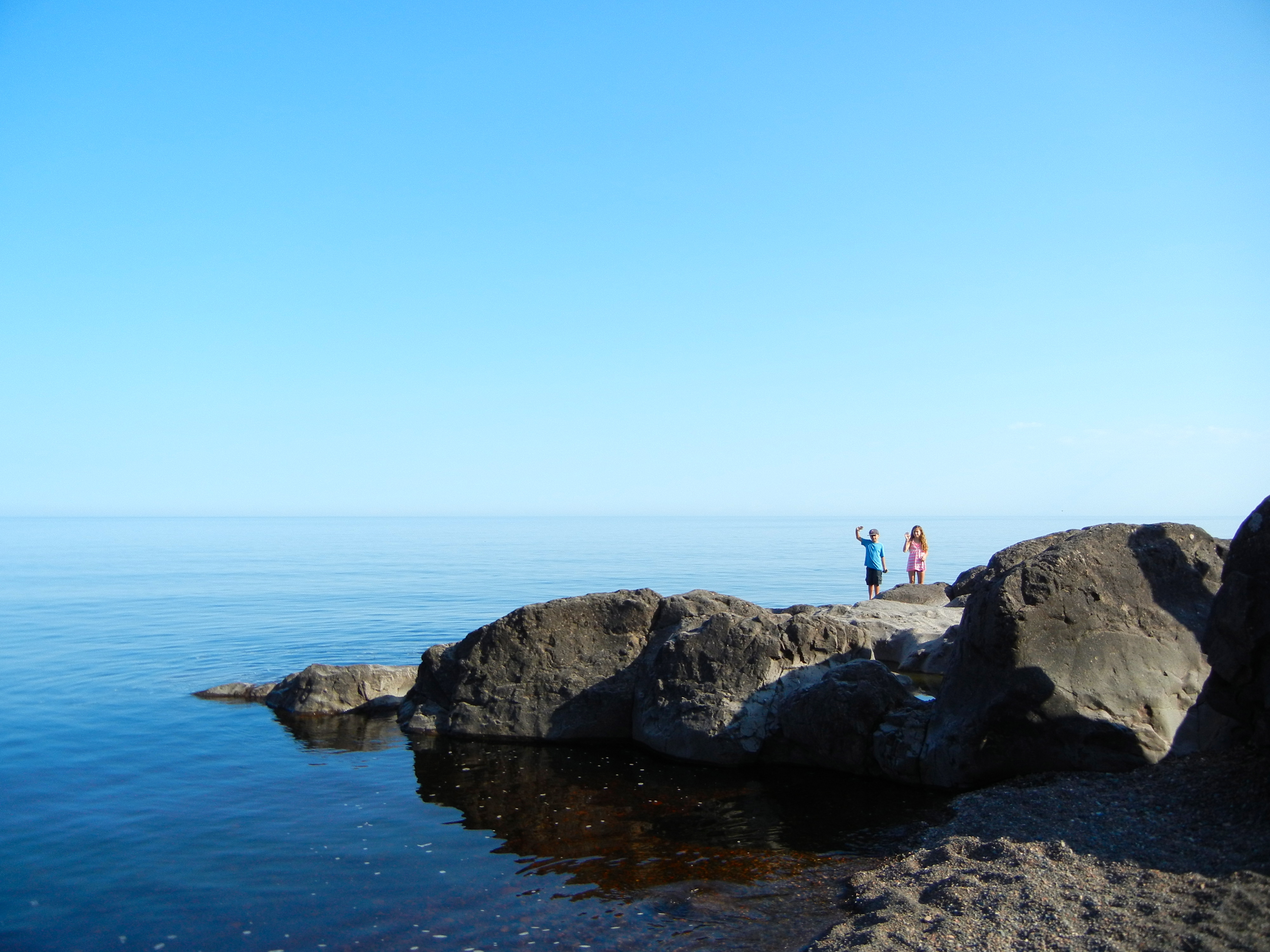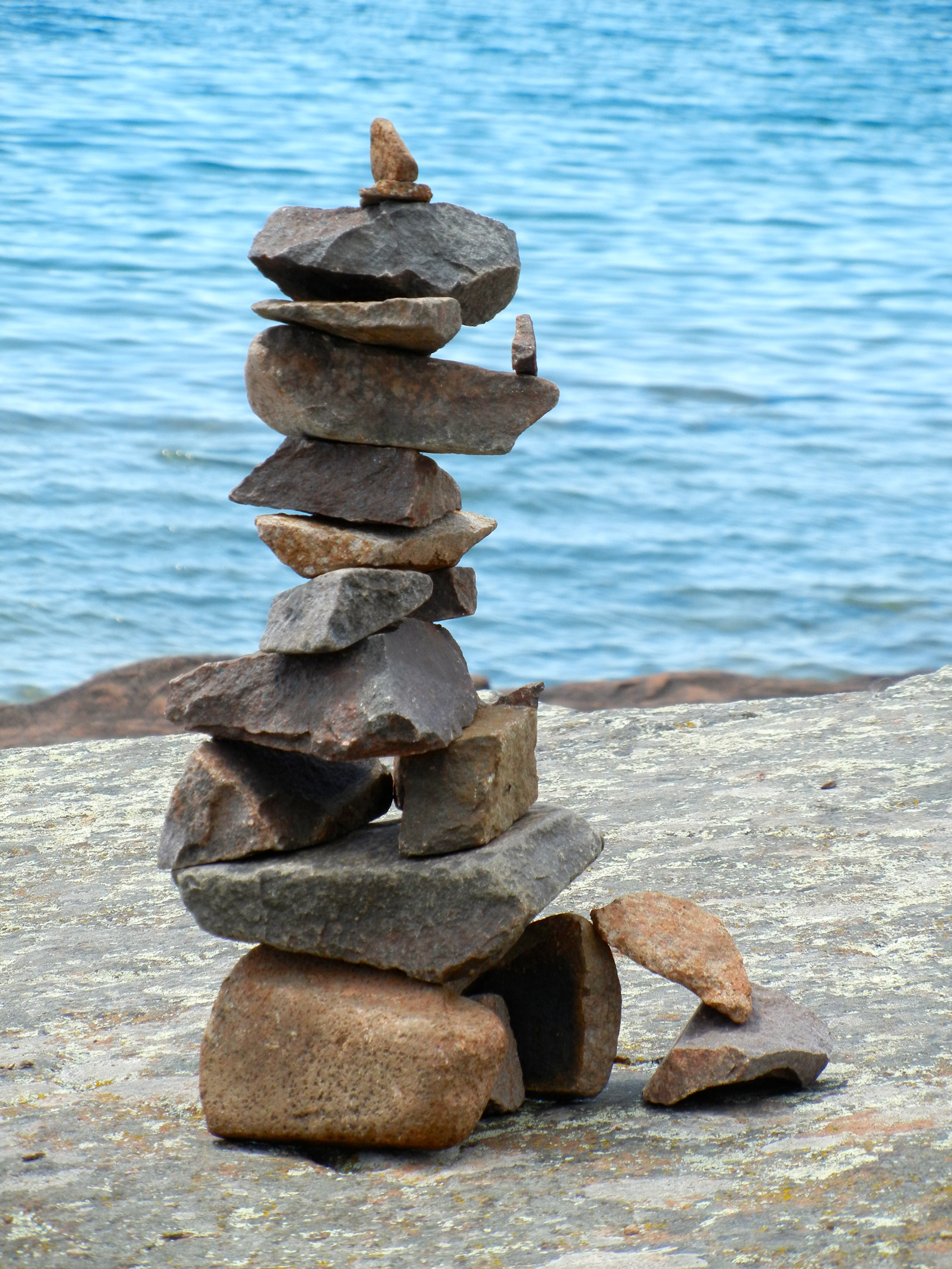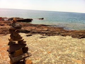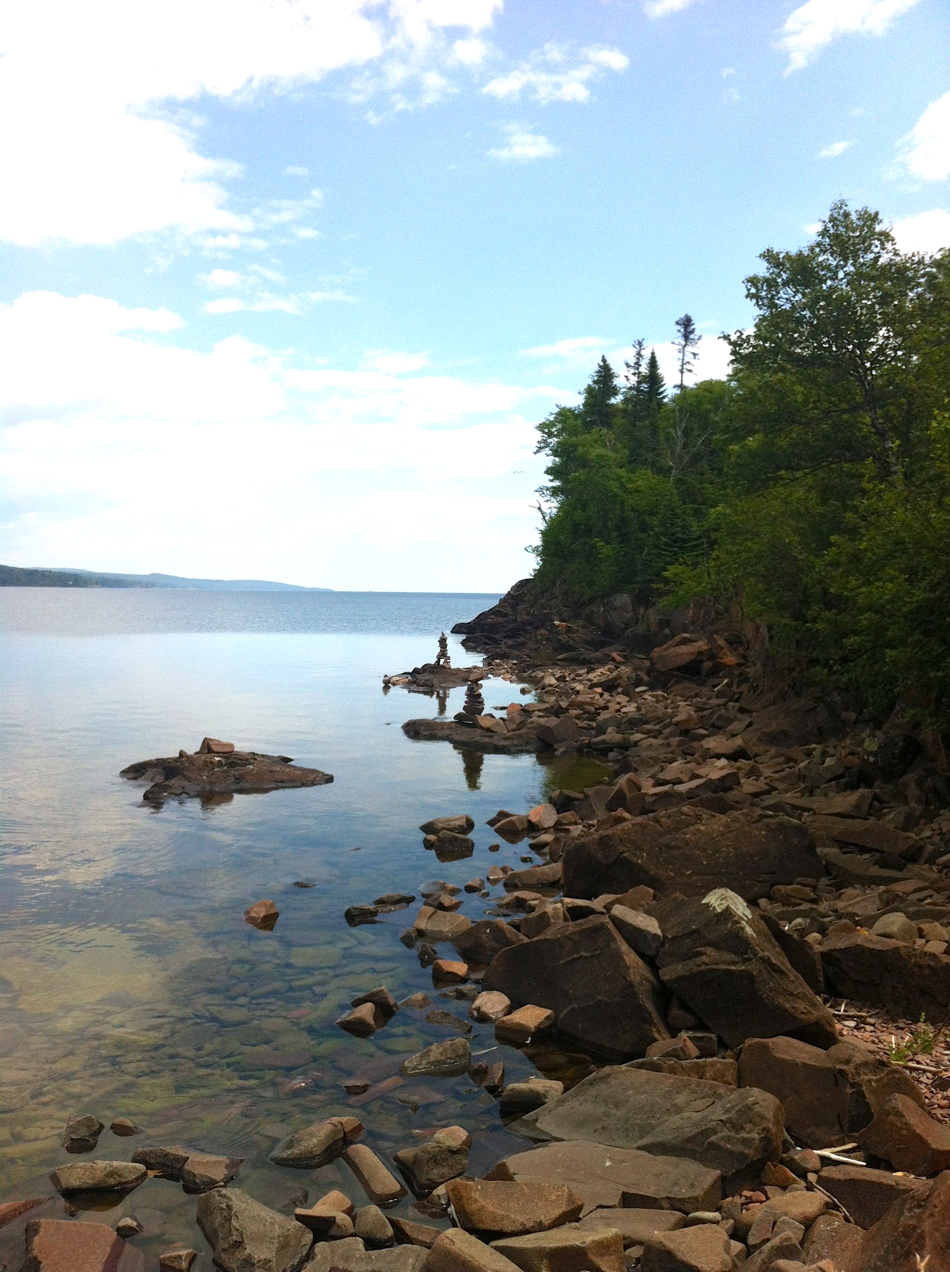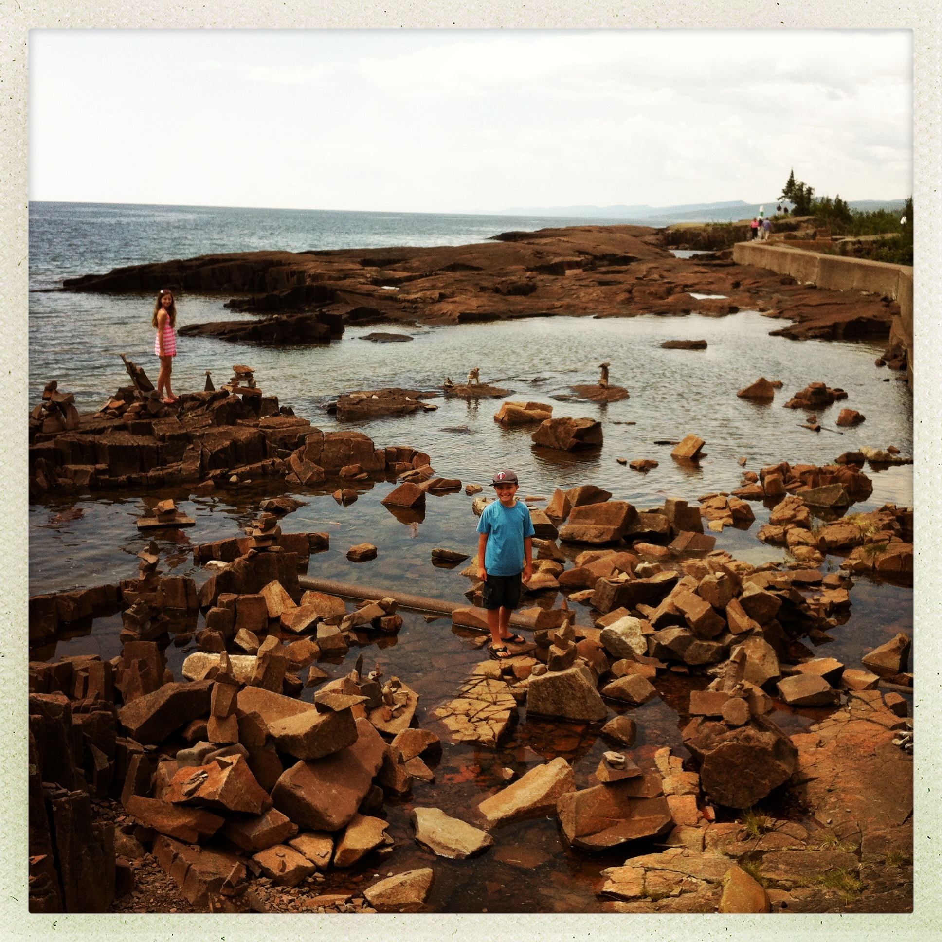 We arrived in Grand Marais, parked the van and headed out on the shoreline to stretch out our legs after the long ride. First thing I noticed, the beach was all rocks. No sand, just tiny, shiny, gorgeous little rocks! Walking a little further, we happened upon this cool rock…totally meant to be. And then we started seeing these rock sculptures.