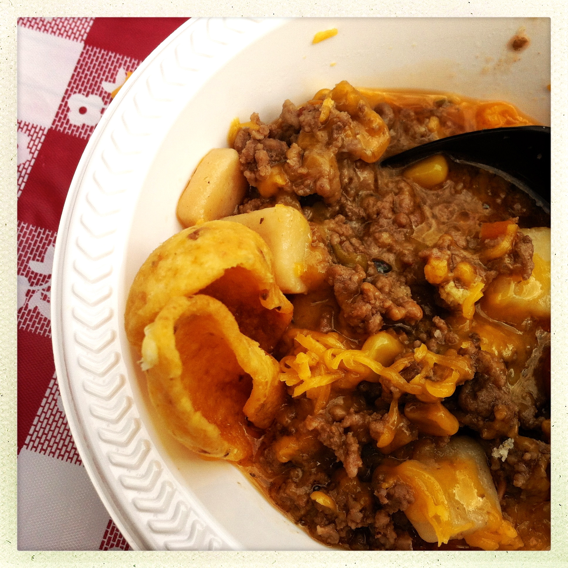 You’ll need: {2 pounds ground beef} + {1 tablespoon of dehydrated onion/onion powder or 1/2 minced onion} + {4 cans vegetable soup, condensed if you can deal with it} + {1 cup of water} + {salt, pepper, garlic to taste} + {2 cups grated cheese} + {corn or tortilla chips}