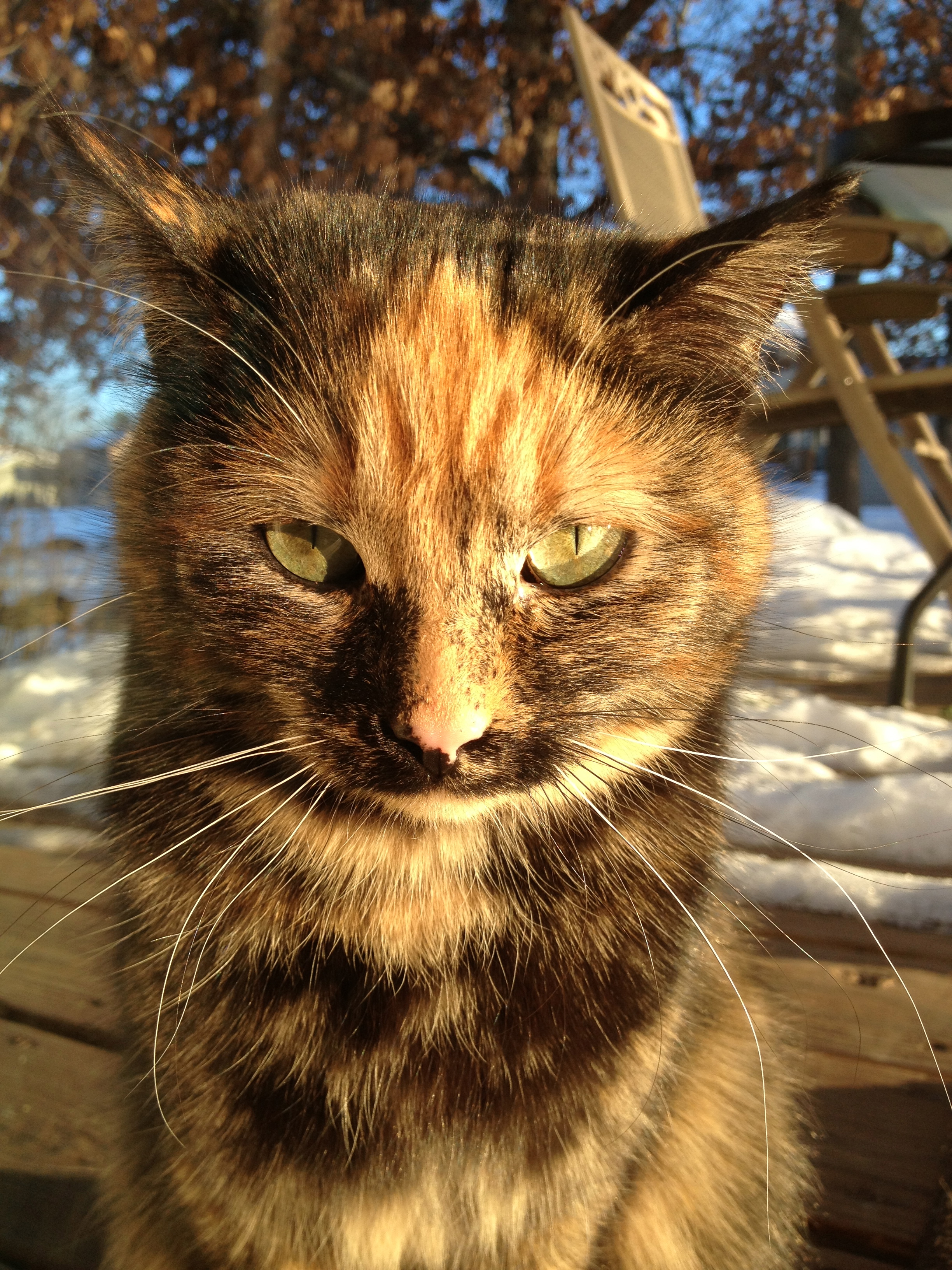 That night, she knocked down a couple of huge closet doors I had propped up against the baby gate. So, I gave her free reign of the entire basement. Each day, she’s gotten more & more comfortable with us. We’ve been letting her come upstairs to roam a bit, putting the other two cats in a room and closing all the doors to bedrooms etc. She definitely wants to go back outside. She has this cry that as a mother, makes me want to weep. I’ve had to continuously remind myself that even though she doesn’t know it, I am trying to help her. And with the temperatures outside below zero (this morning was -17) I feel much better knowing she’s inside than out there. I called my neighbor last night who had the Daddy-cat and was trying to get Mama-cat inside as we spoke. She looks very much like Beatrice & is as afraid of humans as she is! He said he hadn’t seen the other two siblings, so I offered up my kennel & some wet food to see if he could grab them that night. Haven’t heard back from him today…fingers crossed!