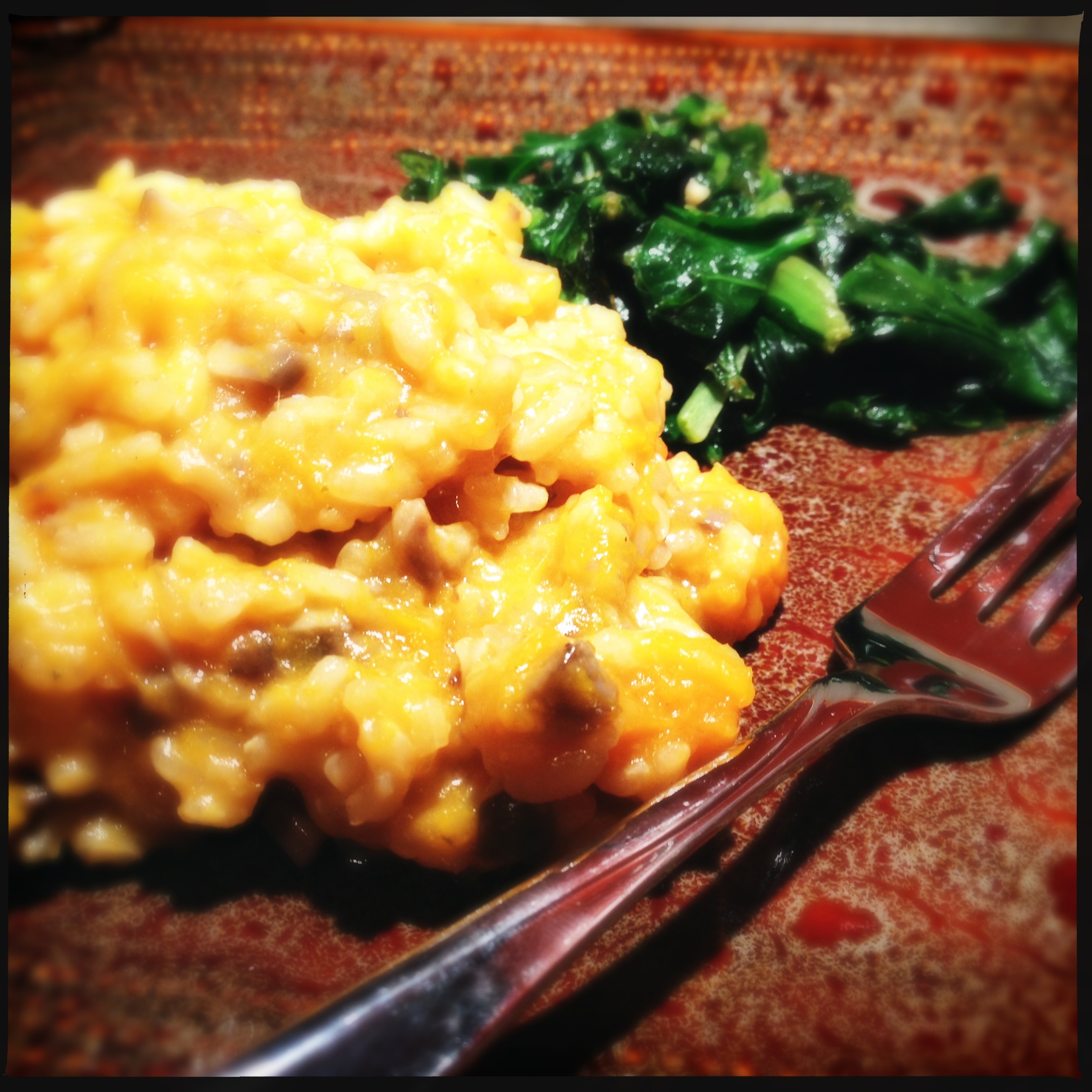 On one of the coldest nights we had Butternut Squash Risotto. I think Risotto intimidates people, but it’s actually really easy! All it involves is a lot of stirring, as you slowly incorporate the liquid into the rice. You should try it sometime, it’s so worth the extra time & muscle! Hey, think of it as a mini-workout! 🙂