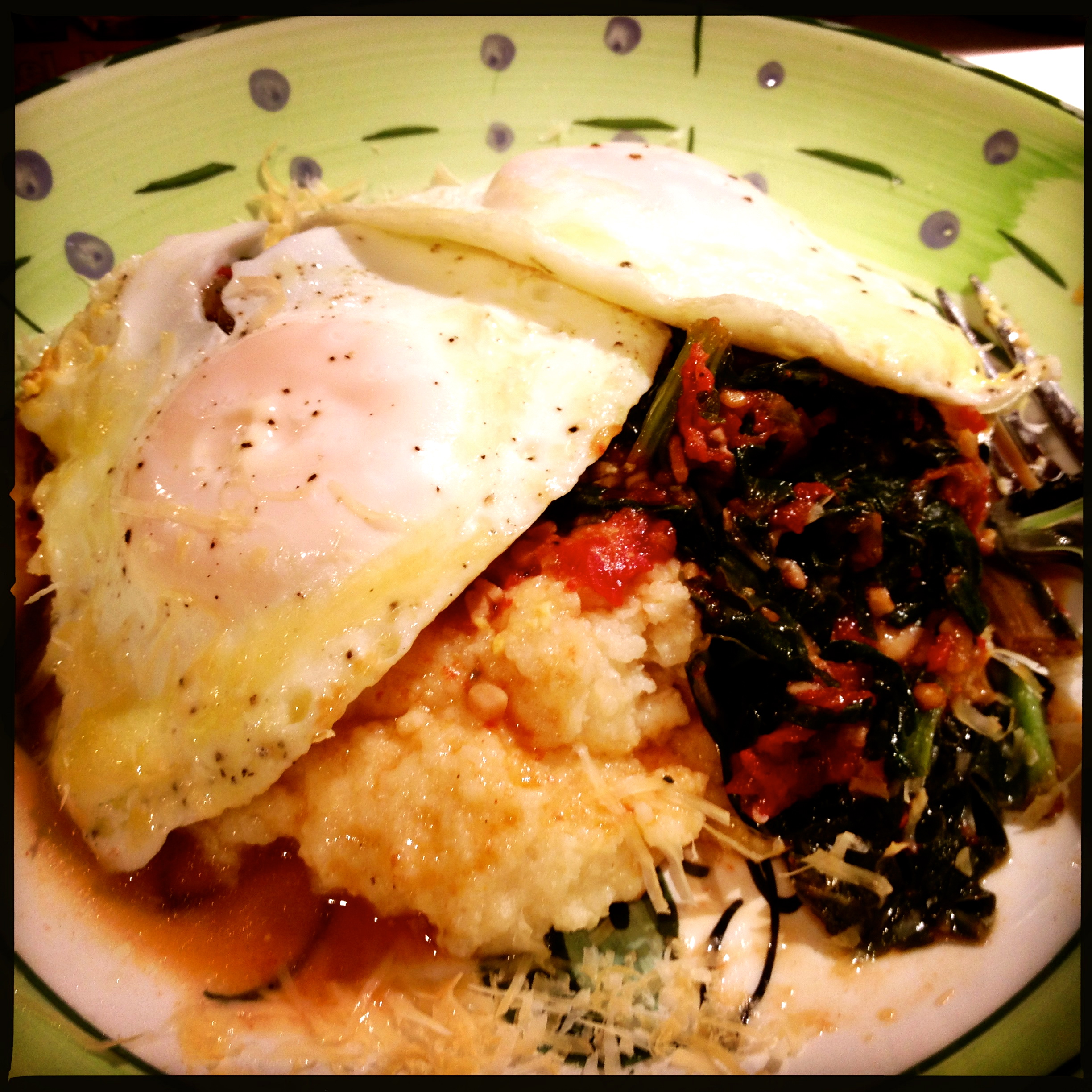 Next night we had Polenta, braised greens & tomatoes and basted eggs. Have I told you I could eat eggs everyday? Yep, I love me some eggies 🙂 Someone recently asked what my favorite three foods were. Wanna guess my response? Eggs, cheese & BACON!! I am truly a Minnesota-Iowa girl. Oh and about that, anyone know where I can get a really good, freaky huge, totally calorie-laden Pork Tenderloin sandwich here in the Twin Cities? I want the kind that is three times bigger than the bun, with pickle slices and gobs of mayo….like I used to get at the local Hy-Vee foods near my work….sad isn’t it? It still haunts me 🙂