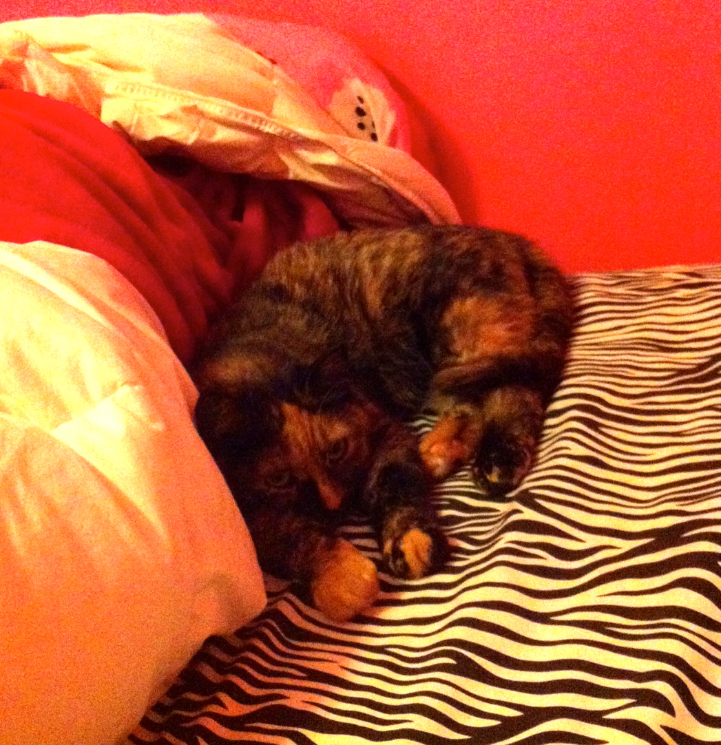 Over the past week, she has gotten braver & braver with us, hanging out on my daughters bed with the crabby cat (Augie) and just tonight she crawled up next to me on the couch, like a real house cat! Still not excited about us touching her, but we’ve been able to get a few pets in the past couple days. Baby steps…or should I say, kitty steps…