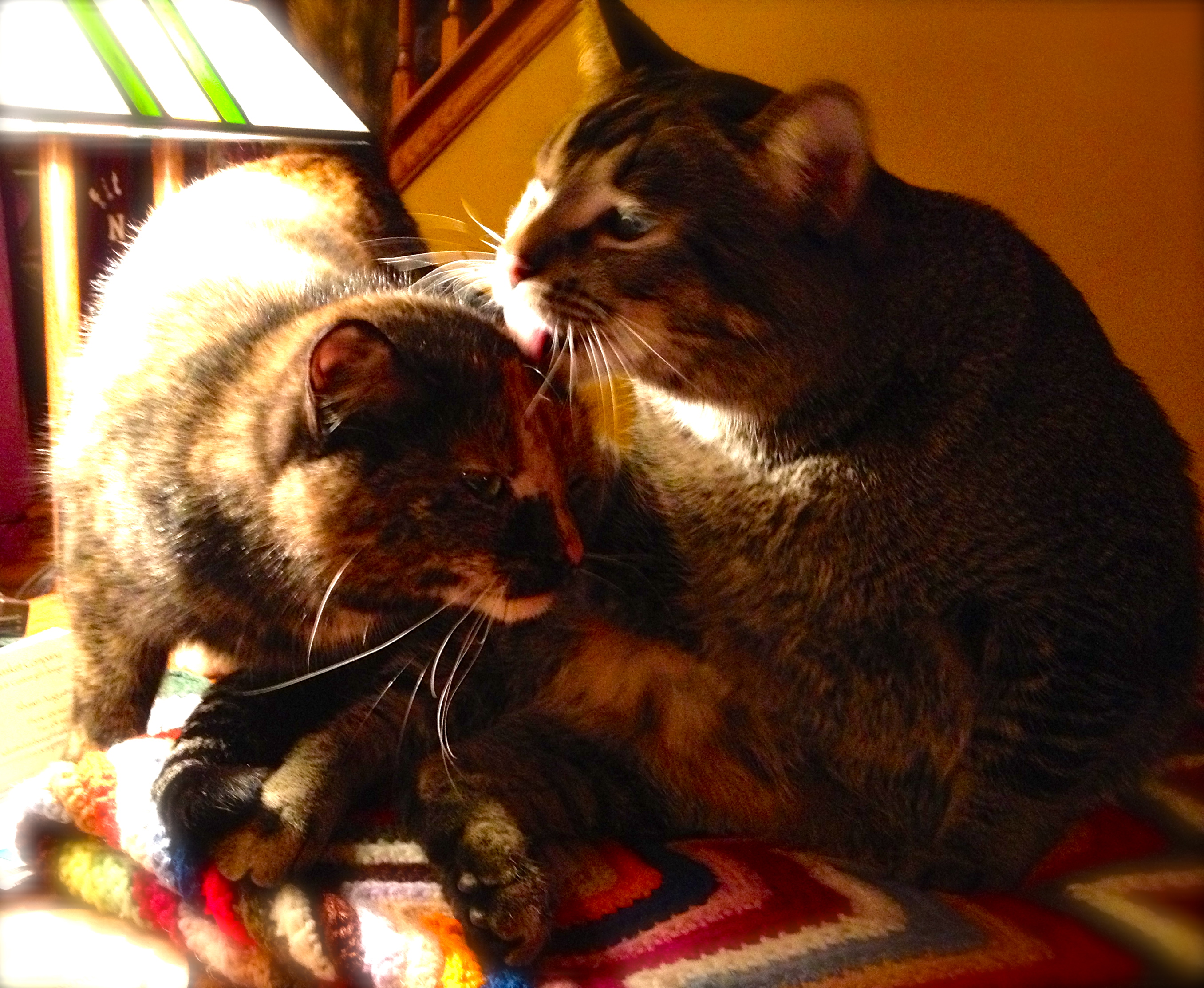 Shortly after getting back home, my youngest cat Indy did another one of his dive bombs at her, to which previously I prevented to the best of my ability. This time, I thought, what the heck, let her kick his little butt, for getting all up in her grill. Well, little did I know, that’s EXACTLY what she wanted!! It was truly love at first sight. She immediately became a totally different cat. Flopping down on the floor in front of him, rolling around with her belly up in the air…cat flirtation at its best! So, I let her hang out with the other cats, which obviously she is most comfortable with, being she has been running with her “herd” the past 10-ish months.