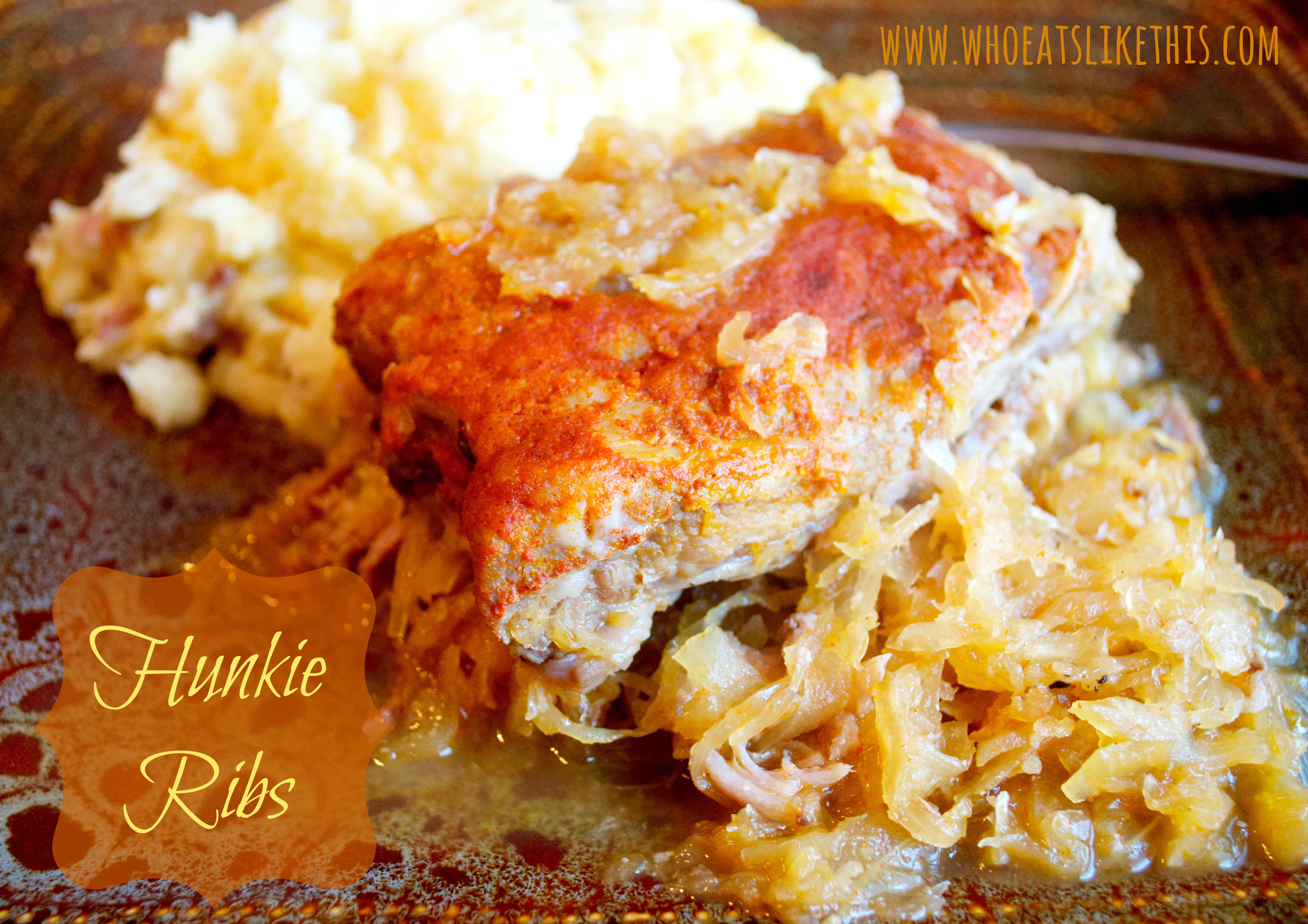 So let’s talk about Hunkie Ribs. I know, the name is strange. The dish is a bit as well. My husbands (partly Hungarian) father makes this dish and ever since I’ve been with my husband, he’s been making this for me. It’s mostly a winter dish, because it can be pretty heavy if you choose to eat it with mashed potatoes. I haven’t ever tried it on the grill (using my dutch oven or something similar) but might give that a go this summer. And you have to like sauerkraut to like the dish! Did you know, sauerkraut can be enjoyed on things other than hotdogs & brats?! Actually, you wouldn’t even have to eat much of the sauerkraut to enjoy the dish, as you’ll see, the ribs cook on top of the sauerkraut, soaking in all that deliciousness from the kraut! But come on, give it a try! I LOVE the sauerkraut mixed into my potatoes! 🙂