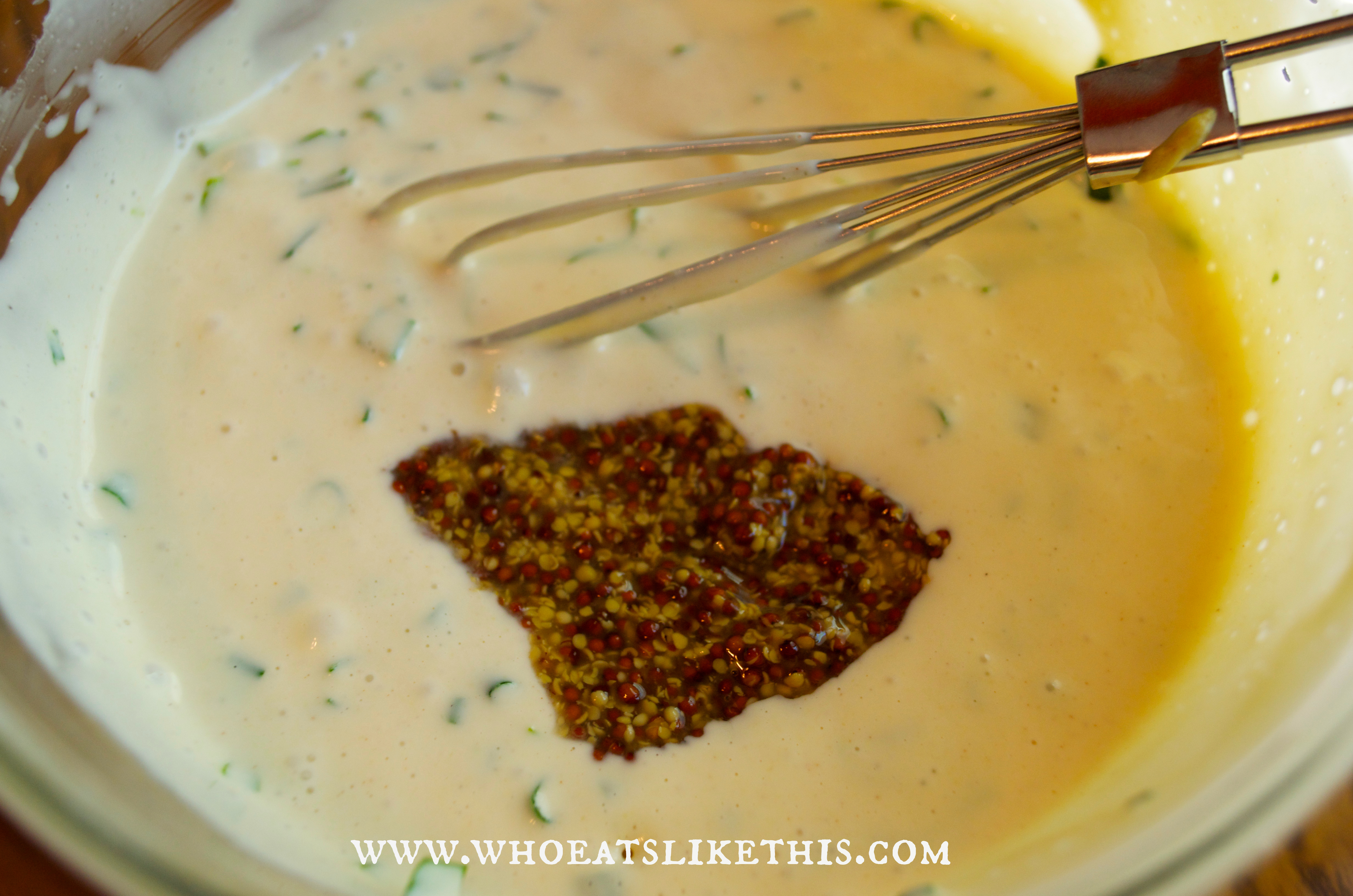 In a separate bowl, mix together your apple cider vinegar, sugar, mayo & Dijon mustard. Taste to be sure you have a balance of sweet, sour etc.
