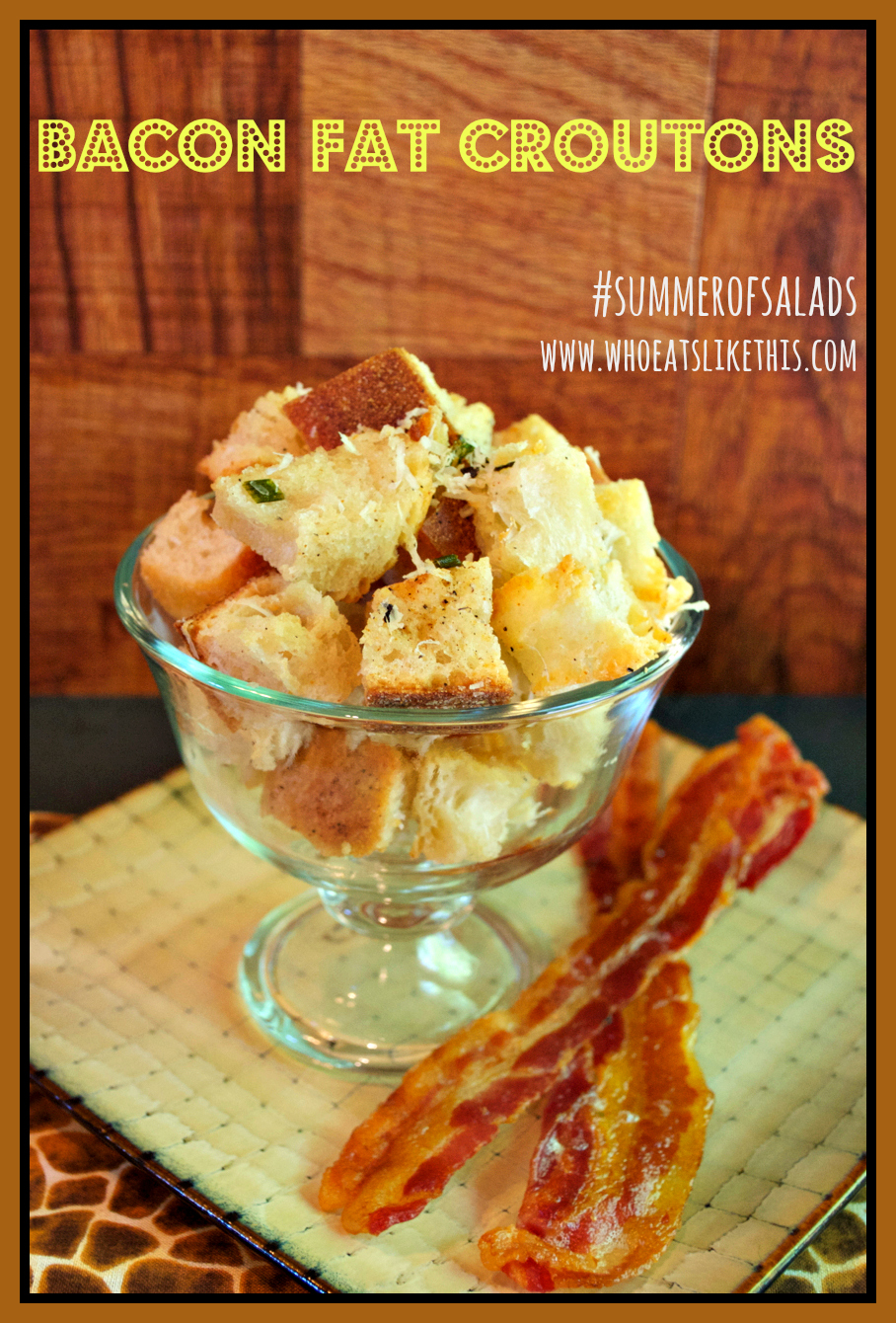 So, first let’s tackle the recipe I made for this post- Bacon Fat Croutons. Yes to bacon fat! You won’t be surprised to hear that we eat alot of Bacon in our house…but you might be surprised to hear I actually keep the bacon fat in the fridge for later use. Yep, kinda gross, but mostly amazing! In fact, I saw this recipe for Bacon Fat Chocolate Chip Cookies the other and it’s sitting on my counter, waiting to be made! YES to bacon fat! This is what you’ll need: