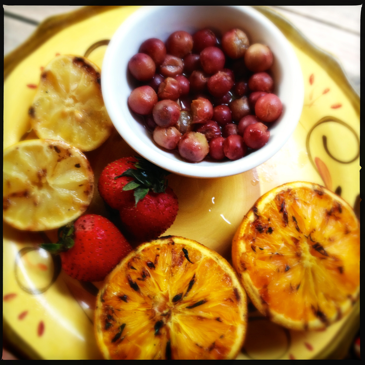 In putting together this post, I decided my focus was to be Sangria. I had many friends share their Sangria recipes with me. One of those, listed below, was given to me by husband & wife foodie duo, Lynne & Keith Morioka. It’s what I will be making next! I was also surprised to see what a popular drink it has become, with so many delicious variations on the traditional white or red Sangria. We are gearing up for a birthday-Father’s day camping weekend and so I thought it would be fun to make a batch to bring with us. I decided to try the Grilled Citrus and Grape Sangria. In the future, I am going to try to gently smoke some fruit for a Sangria too!