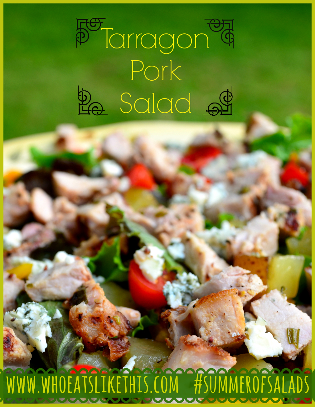 I know you’ve heard me talk about Tarragon before in this amazing potato salad, but we fell in love with Tarragon using it on the Pork Chops I am sharing here today. This post is about Pork, and how to enjoy it on a salad. I realize that Bacon falls into the Pork category, but I am saving Bacon for it’s very own post…I love it just that much! 🙂