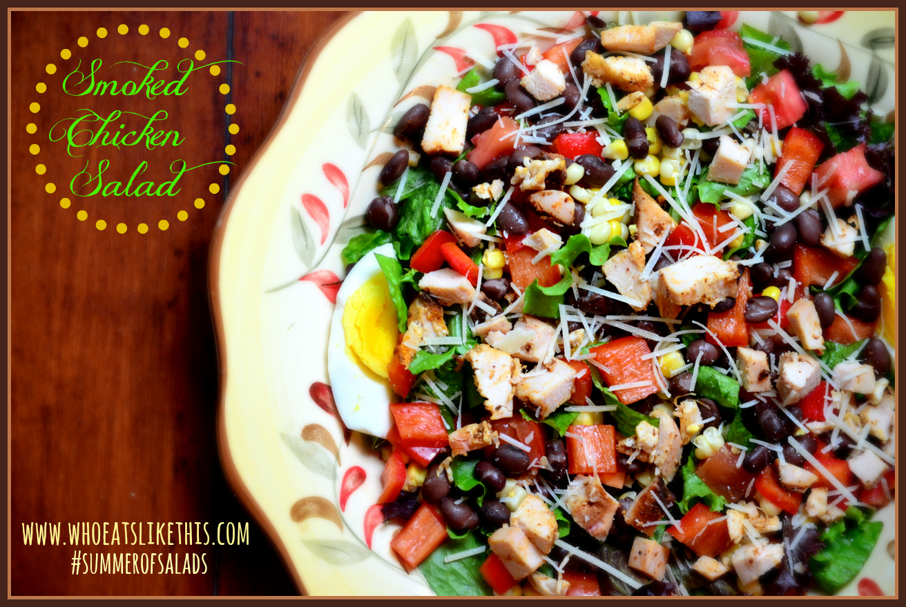 So for this salad, you’ll want to gather your favorite greens, and then chop up your Smoked Chicken. I added Black Beans, fresh roasted Corn-cut from the cob, chopped tomatoes, red bell pepper, hard boiled eggs and finished the salad with a small sprinkling of Parmesan cheese & crumbled Blue Cheese! (have I mentioned I am a cheese-addict?) Be careful how much Blue Cheese you put on; you don’t want to drown out that smokey Chicken goodness! Add any combination of “salad fixin’s” you like! It’s your salad silly!