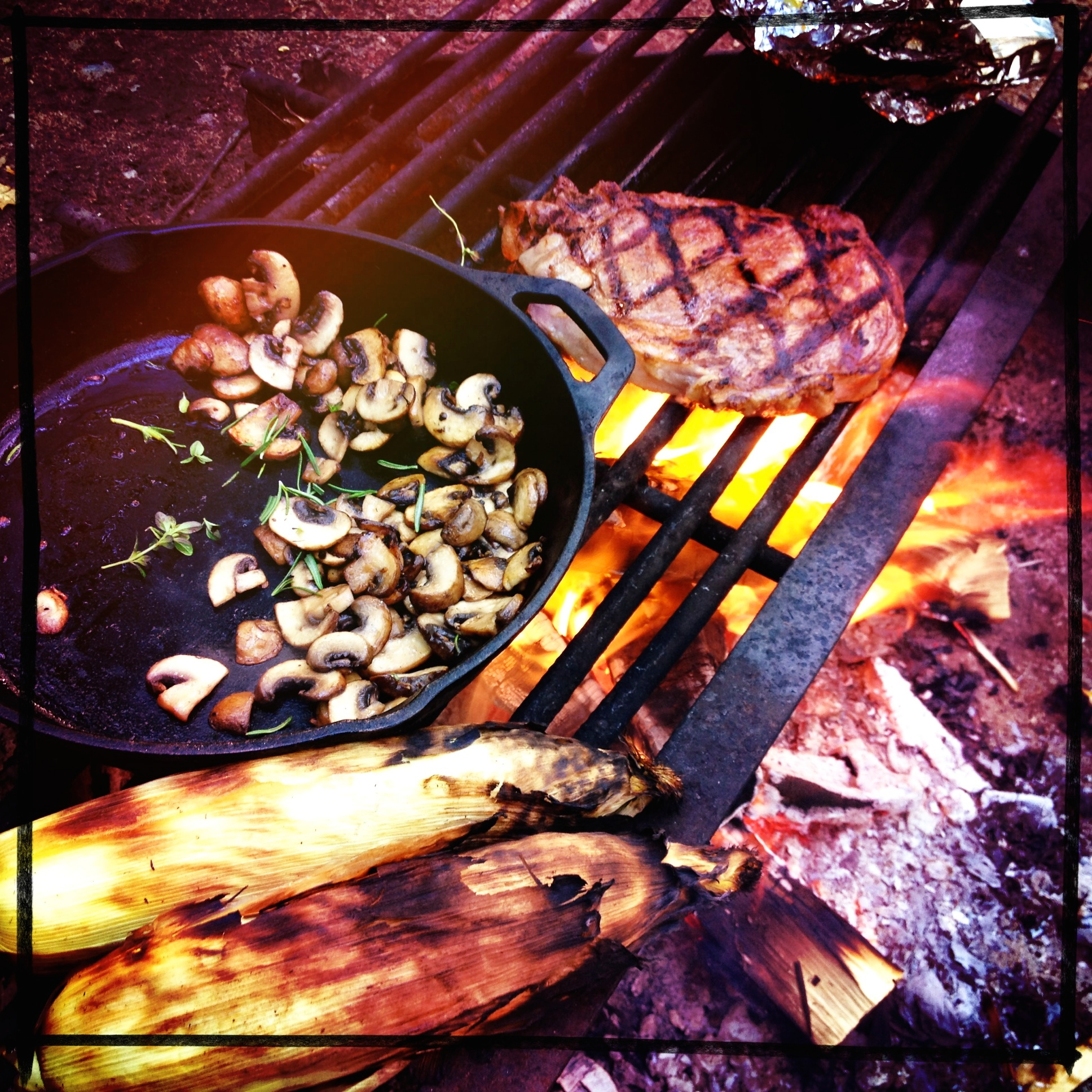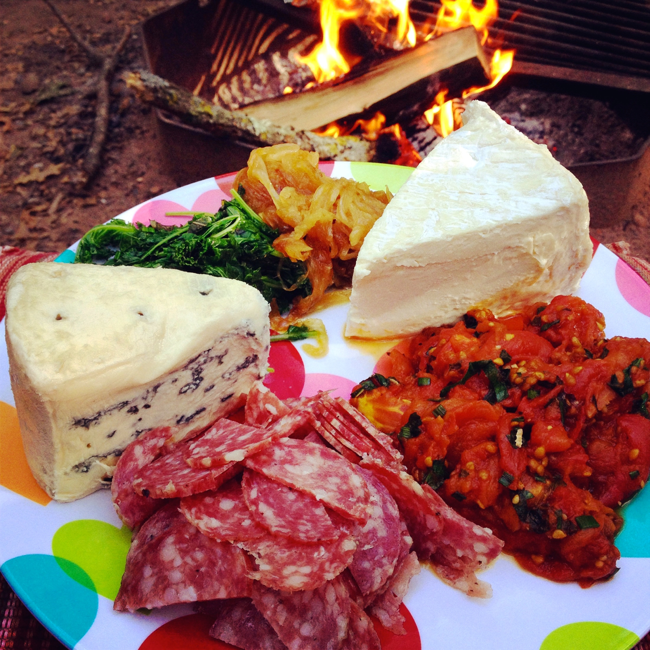 In addition to this steak, mushrooms, onions & herbs, corn and potato packet meal, we had stuffed french toast…and the best meal (at least to me) was the Carpet Picnic! I can’t remember if I’ve ever talked to you about our Carpet Picnic’s…in fact, that might be a fun thing to blog about! Basically we roast up some Roma tomatoes, caramelize a sweet onion-sliced very thin, roast a big head of garlic, buy a good salami, a loaf of crusty french bread (ciabbata works great too) and cheese…usually it’s Brie or Camembert when at home, warmed in the oven so it’s gooey. But this time we splurged and got a Triple Cream Brie and a creamy Blue, neither needing warming so they were good choices for camping. We also sautéed some Kale from our garden and instead of the roasted garlic, we bought some fermented black garlic from Trader Joes. It was SO good!