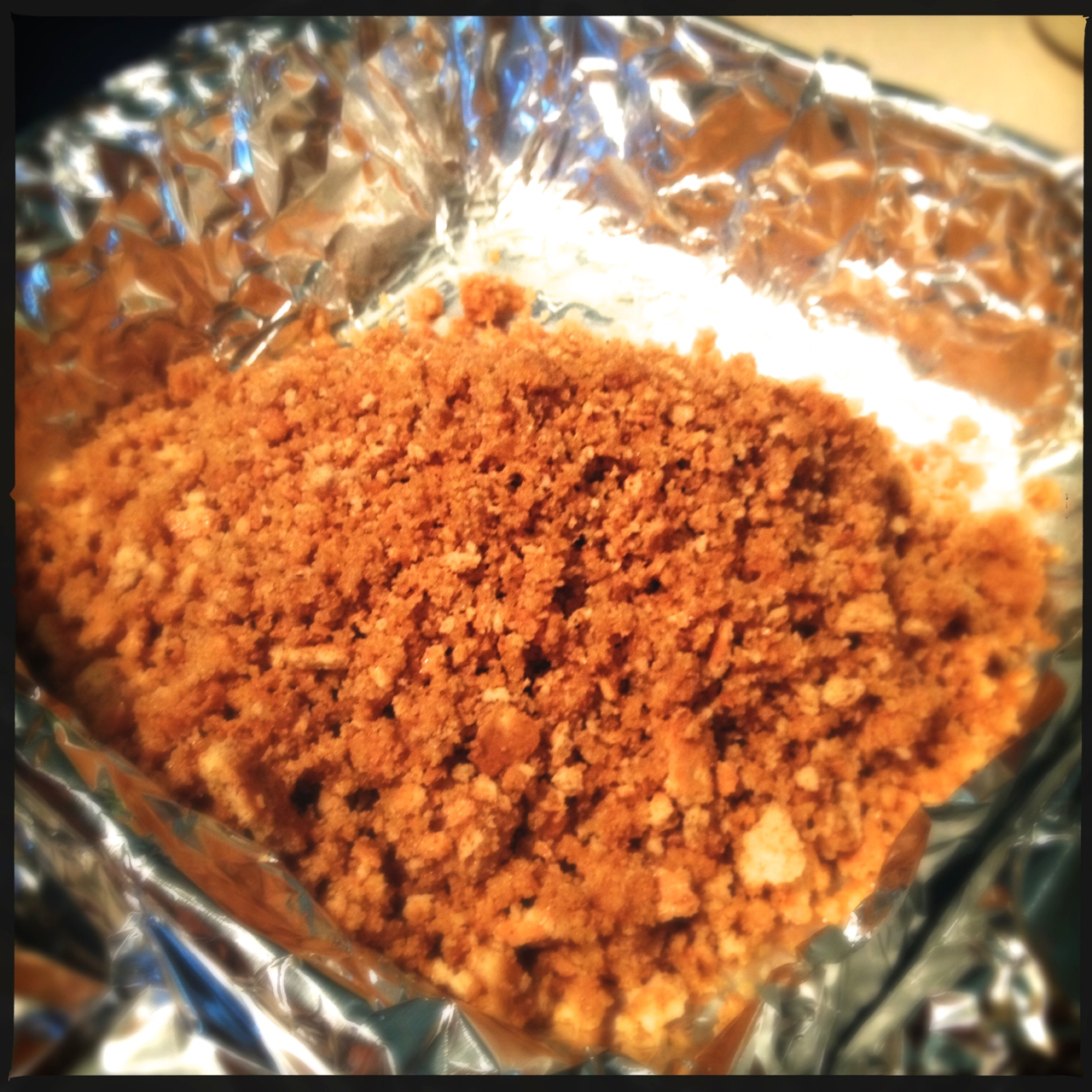 Crust: Lightly butter the foil, (including up the sides) with some of the melted butter, using a pastry brush if you have one, or fingers work great too! Mix together the crushed graham cracker crumbs, sugar, pinch of salt and melted butter. Attempt NOT to eat this immediately. 🙂 Press the crumb mixture evenly over the bottom of the pan, and place in the preheated oven. Bake about 20 minutes, or at least golden brown all over. (more so than when you started…as the crumbs are already golden brown!)