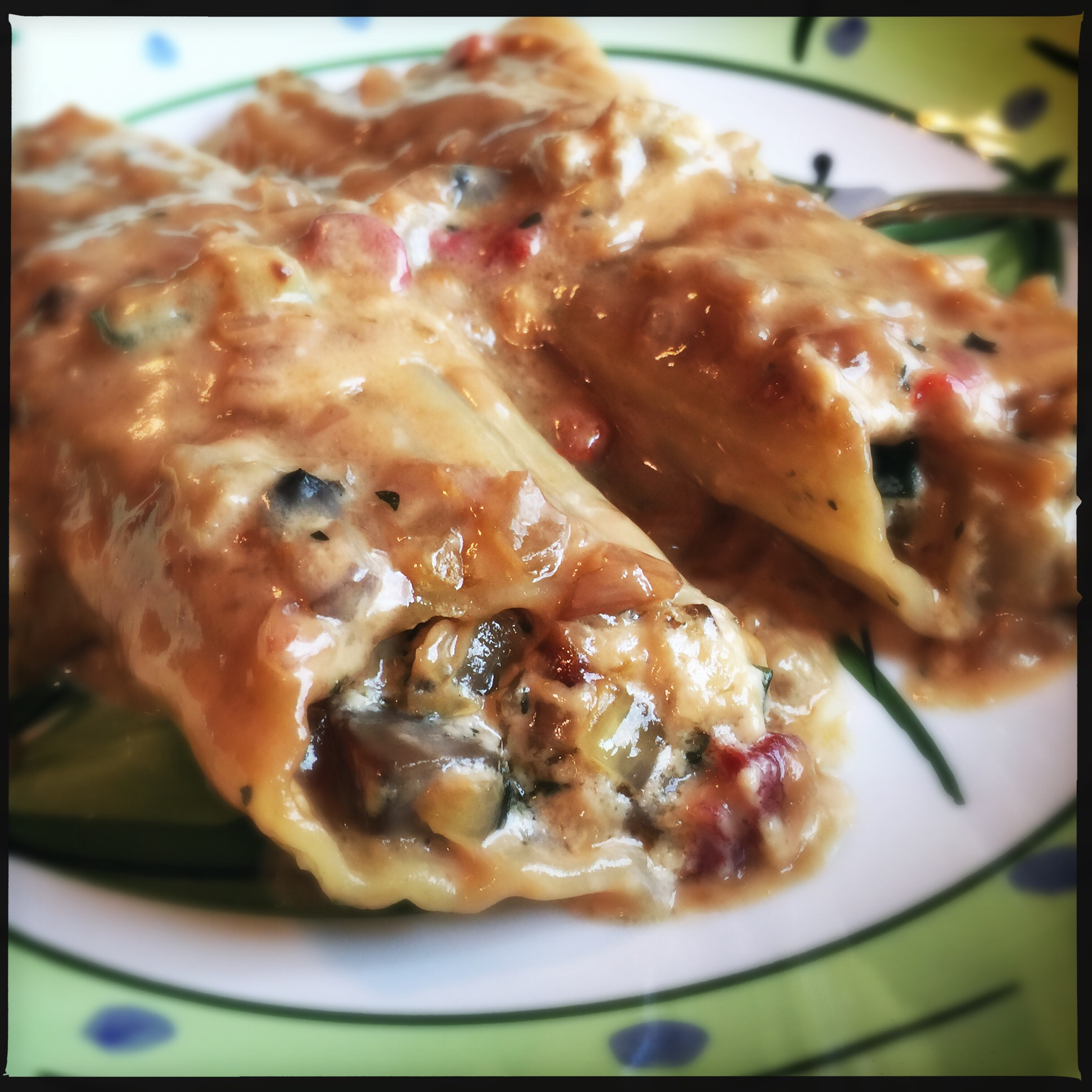 The recipe was called “Vegetable Stuffed Cannelloni with a Sherry Cream Sauce”… or something like that. I did find a recipe on Epicurious that was very similar. The original recipe was destroyed…on purpose…after the failed meal. You can see that recipe here.