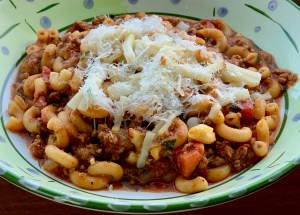 Preheat a stock pot on the stove to high…add olive oil and onions. Saute for a minute or two, getting it good and hot. Add in ground beef and using a wooden spoon or similar, chop up the meat as best you can. Continue cooking the meat until all of the liquid has evaporated and the meat is cooked thru. Add in the garlic and stir to cook. Then add in all your spices, including the salt & pepper, but waiting on the bay leaves. Cook until you really smell all those spices “blooming” in the pan. Then add in your broth or water…diced tomatoes and Marinara sauce. Then add the soy sauce…as Chef John says, don’t be tempted to use Worcestershire sauce…trust me on the soy sauce. Let this mixture bubble away on the stove on medium, for at least 20 minutes if you can.