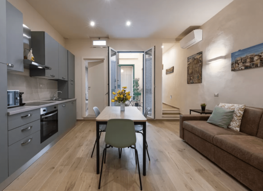 The apartment itself was really nice! Up only one flight of stairs, (if you’ve ever stayed anywhere in Italy, you’ll know that’s a big deal!) each couple had their own bedroom and bathroom and the common areas had a big kitchen, living & dining area. We also had a washing machine that we used as well (bring your own detergent or buy some at a local store, because they usually don’t supply that) and the center of the apartment was an open air patio (meaning you look up and see sky, but the apartment surrounded it) and it was a fun hang out spot for our first afternoon, with a conveniently located wine store, right across the street! 🍷